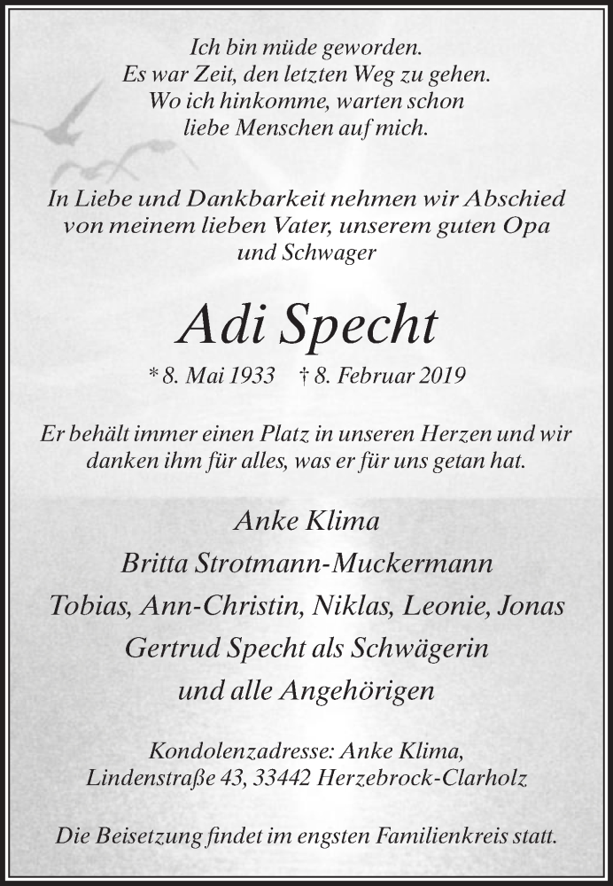 Hier finden Sie alle Traueranzeigen aus der Zeitung, die bisher für Adi Specht erschienen sind. Weitere Traueranzeigen, die in der Zeitung erscheinen, werden hier ebenfalls aufgelistet