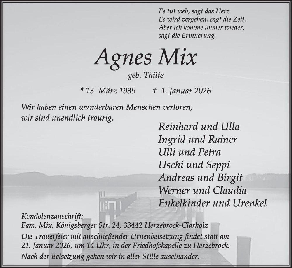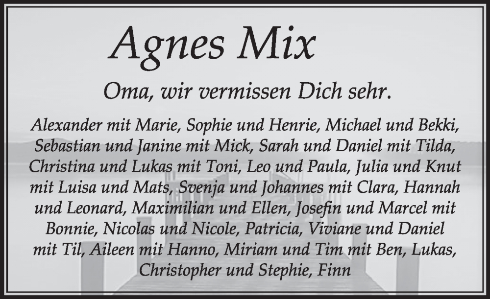 Hier finden Sie alle Traueranzeigen aus der Zeitung, die bisher für Agnes Mix erschienen sind. Weitere Traueranzeigen, die in der Zeitung erscheinen, werden hier ebenfalls aufgelistet