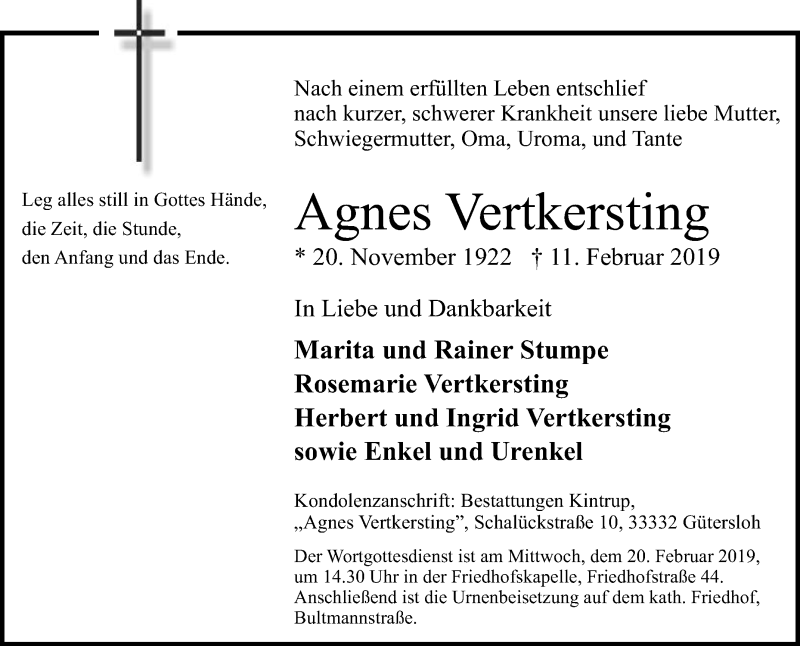 Hier finden Sie alle Traueranzeigen aus der Zeitung, die bisher für Agnes Vertkersting erschienen sind. Weitere Traueranzeigen, die in der Zeitung erscheinen, werden hier ebenfalls aufgelistet