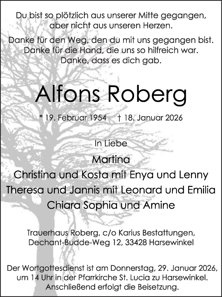Hier finden Sie alle Traueranzeigen aus der Zeitung, die bisher für Alfons Roberg erschienen sind. Weitere Traueranzeigen, die in der Zeitung erscheinen, werden hier ebenfalls aufgelistet
