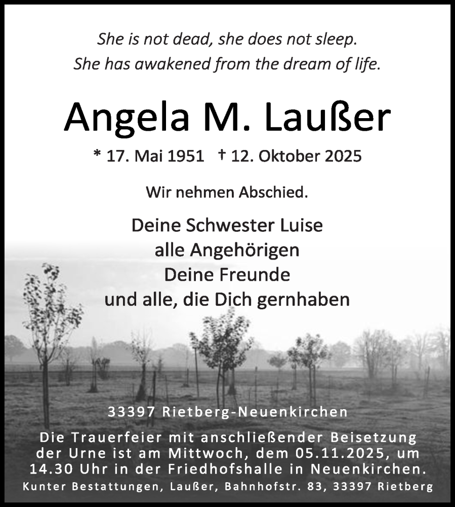 Hier finden Sie alle Traueranzeigen aus der Zeitung, die bisher für Angela M. Laußer erschienen sind. Weitere Traueranzeigen, die in der Zeitung erscheinen, werden hier ebenfalls aufgelistet