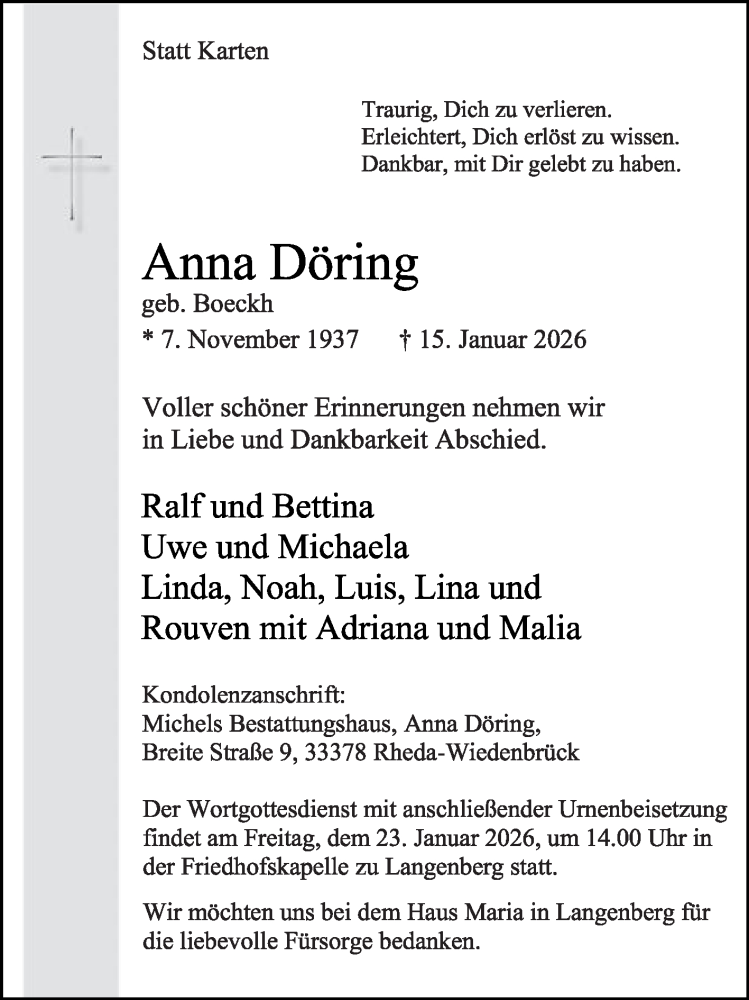 Hier finden Sie alle Traueranzeigen aus der Zeitung, die bisher für Anna Döring erschienen sind. Weitere Traueranzeigen, die in der Zeitung erscheinen, werden hier ebenfalls aufgelistet