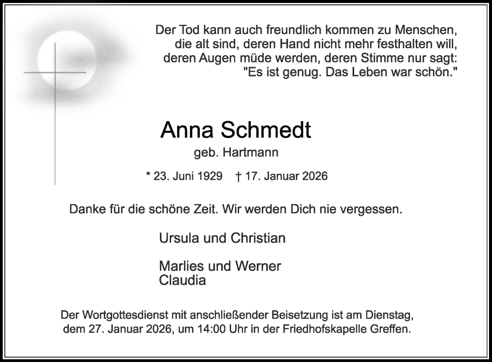 Hier finden Sie alle Traueranzeigen aus der Zeitung, die bisher für Anna Schmedt erschienen sind. Weitere Traueranzeigen, die in der Zeitung erscheinen, werden hier ebenfalls aufgelistet