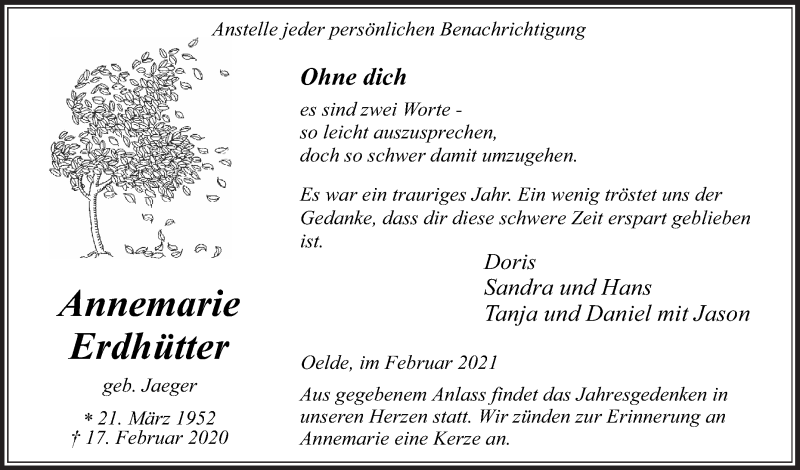 Hier finden Sie alle Traueranzeigen aus der Zeitung, die bisher für Annemarie Erdhütter erschienen sind. Weitere Traueranzeigen, die in der Zeitung erscheinen, werden hier ebenfalls aufgelistet