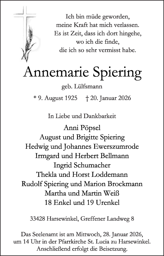 Hier finden Sie alle Traueranzeigen aus der Zeitung, die bisher für Annemarie Spiering erschienen sind. Weitere Traueranzeigen, die in der Zeitung erscheinen, werden hier ebenfalls aufgelistet