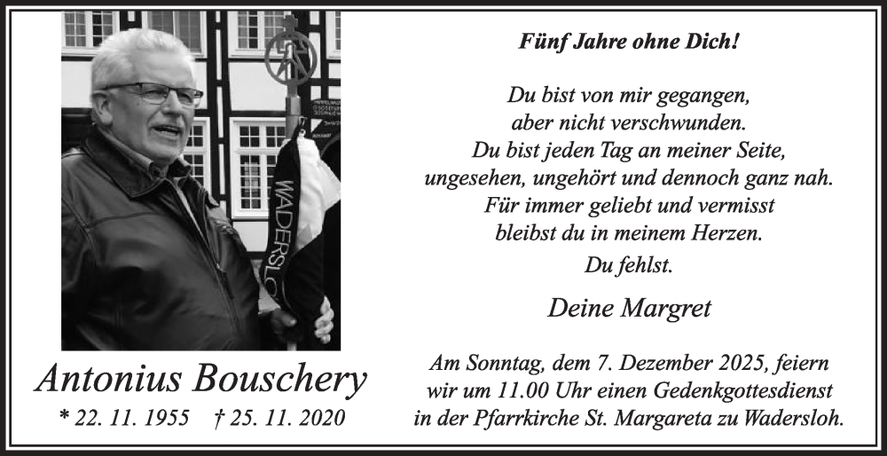 Hier finden Sie alle Traueranzeigen aus der Zeitung, die bisher für Antonius Bouschery erschienen sind. Weitere Traueranzeigen, die in der Zeitung erscheinen, werden hier ebenfalls aufgelistet