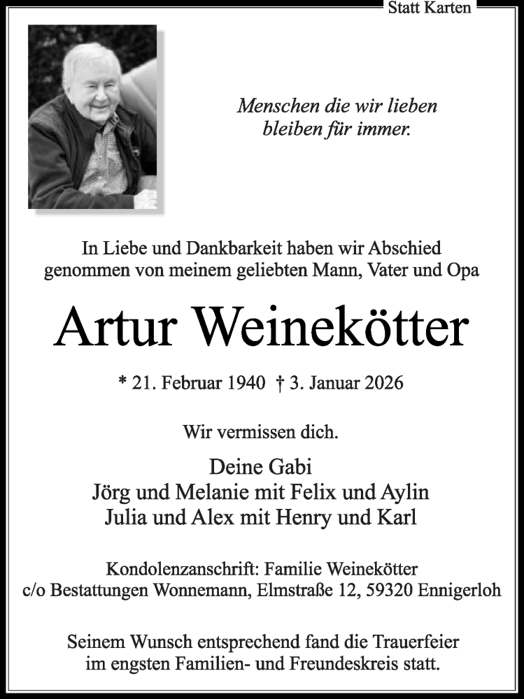 Hier finden Sie alle Traueranzeigen aus der Zeitung, die bisher für Artur Weinekötter erschienen sind. Weitere Traueranzeigen, die in der Zeitung erscheinen, werden hier ebenfalls aufgelistet