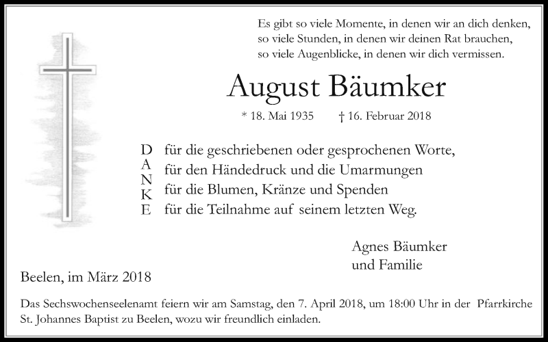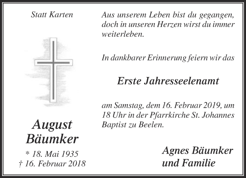 Hier finden Sie alle Traueranzeigen aus der Zeitung, die bisher für August Bäumker erschienen sind. Weitere Traueranzeigen, die in der Zeitung erscheinen, werden hier ebenfalls aufgelistet