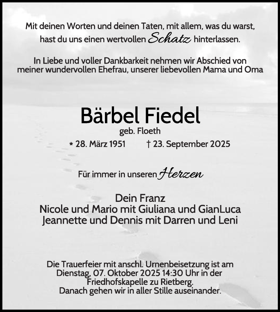 Hier finden Sie alle Traueranzeigen aus der Zeitung, die bisher für Bärbel Fiedel erschienen sind. Weitere Traueranzeigen, die in der Zeitung erscheinen, werden hier ebenfalls aufgelistet