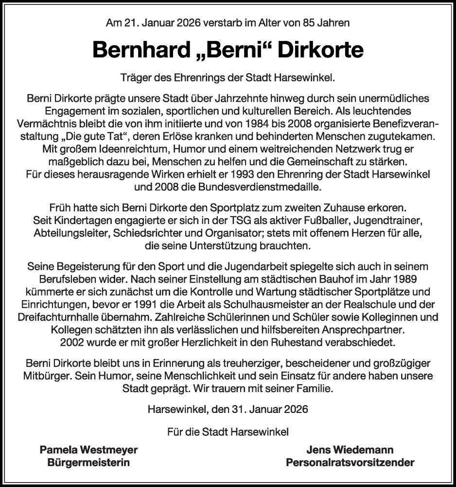 Hier finden Sie alle Traueranzeigen aus der Zeitung, die bisher für Bernhard Dirkorte erschienen sind. Weitere Traueranzeigen, die in der Zeitung erscheinen, werden hier ebenfalls aufgelistet