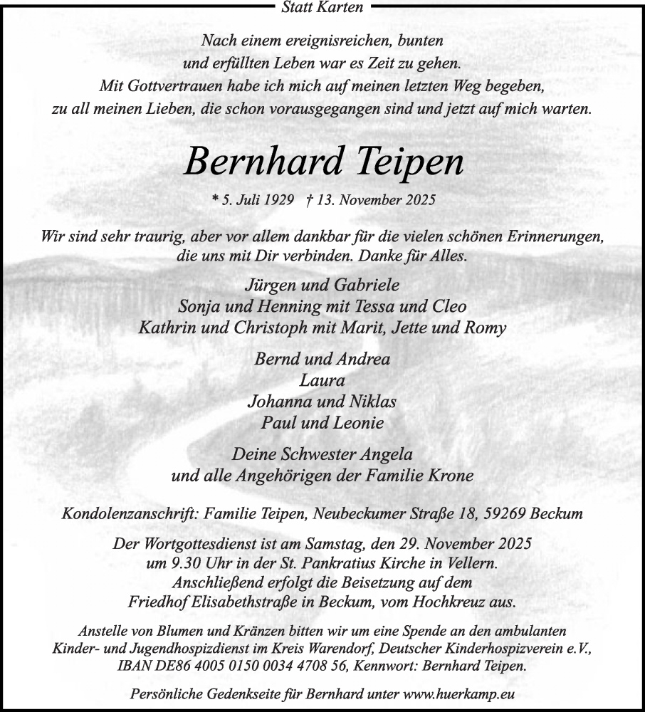 Hier finden Sie alle Traueranzeigen aus der Zeitung, die bisher für Bernhard Teipen erschienen sind. Weitere Traueranzeigen, die in der Zeitung erscheinen, werden hier ebenfalls aufgelistet
