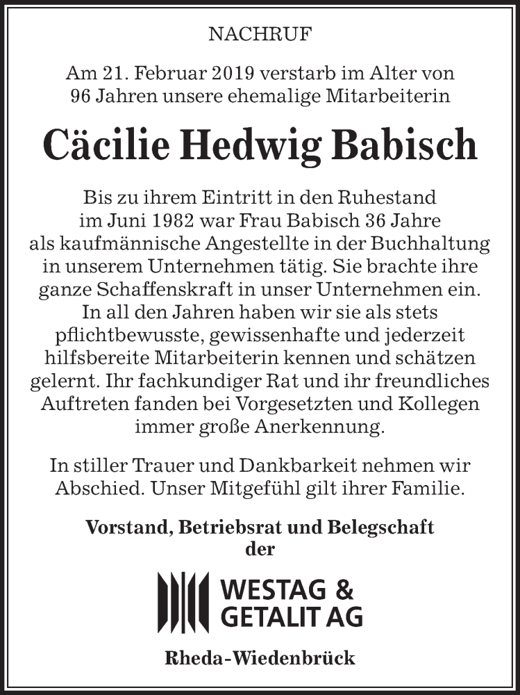 Hier finden Sie alle Traueranzeigen aus der Zeitung, die bisher für Cäcilie Hedwig Babisch erschienen sind. Weitere Traueranzeigen, die in der Zeitung erscheinen, werden hier ebenfalls aufgelistet