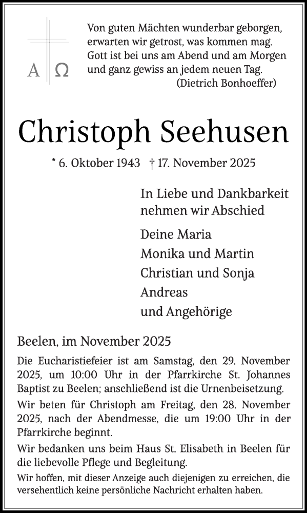 Hier finden Sie alle Traueranzeigen aus der Zeitung, die bisher für Christoph Seehusen erschienen sind. Weitere Traueranzeigen, die in der Zeitung erscheinen, werden hier ebenfalls aufgelistet
