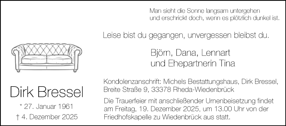 Hier finden Sie alle Traueranzeigen aus der Zeitung, die bisher für Dirk Bressel erschienen sind. Weitere Traueranzeigen, die in der Zeitung erscheinen, werden hier ebenfalls aufgelistet