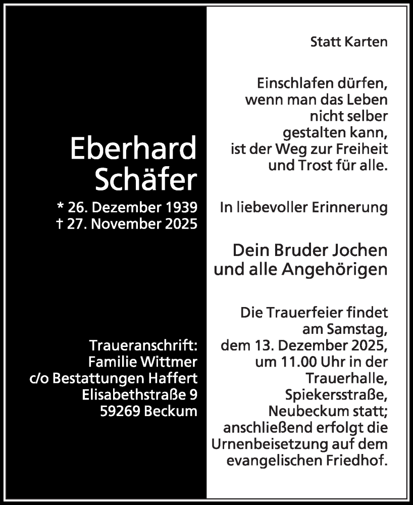 Hier finden Sie alle Traueranzeigen aus der Zeitung, die bisher für Eberhard Schäfer erschienen sind. Weitere Traueranzeigen, die in der Zeitung erscheinen, werden hier ebenfalls aufgelistet
