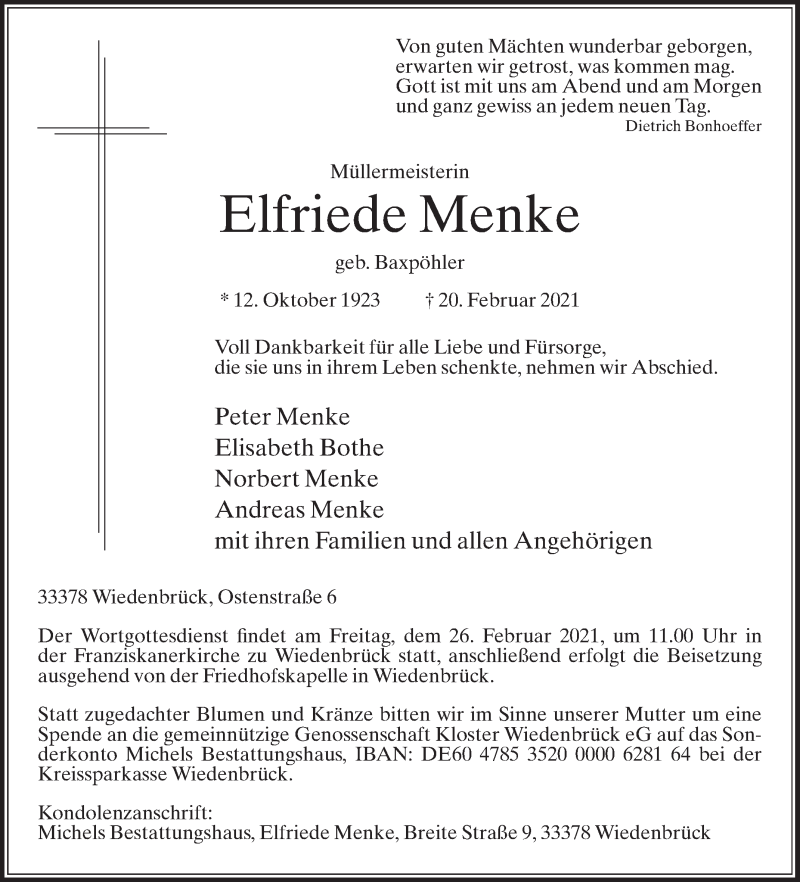 Hier finden Sie alle Traueranzeigen aus der Zeitung, die bisher für Elfriede Menke erschienen sind. Weitere Traueranzeigen, die in der Zeitung erscheinen, werden hier ebenfalls aufgelistet
