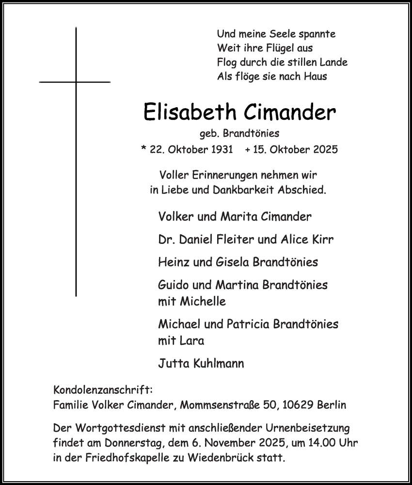 Hier finden Sie alle Traueranzeigen aus der Zeitung, die bisher für Elisabeth Cimander erschienen sind. Weitere Traueranzeigen, die in der Zeitung erscheinen, werden hier ebenfalls aufgelistet