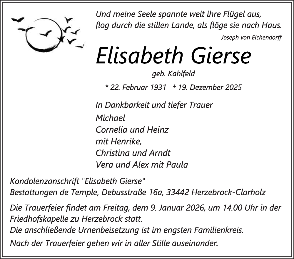 Hier finden Sie alle Traueranzeigen aus der Zeitung, die bisher für Elisabeth Gierse erschienen sind. Weitere Traueranzeigen, die in der Zeitung erscheinen, werden hier ebenfalls aufgelistet