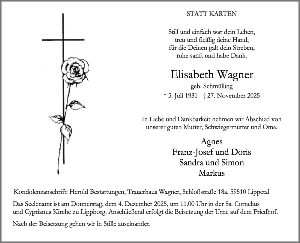Hier finden Sie alle Traueranzeigen aus der Zeitung, die bisher für Elisabeth Wagner erschienen sind. Weitere Traueranzeigen, die in der Zeitung erscheinen, werden hier ebenfalls aufgelistet
