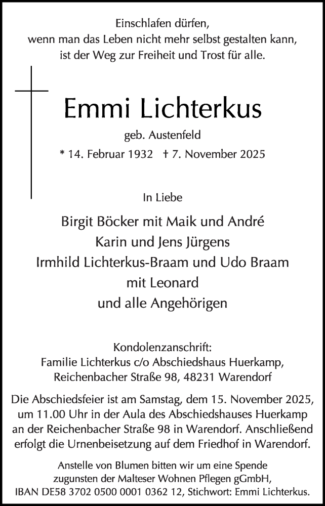 Hier finden Sie alle Traueranzeigen aus der Zeitung, die bisher für Emmi Lichterkus erschienen sind. Weitere Traueranzeigen, die in der Zeitung erscheinen, werden hier ebenfalls aufgelistet