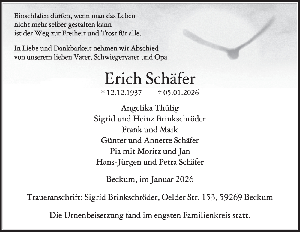 Hier finden Sie alle Traueranzeigen aus der Zeitung, die bisher für Erich Schäfer erschienen sind. Weitere Traueranzeigen, die in der Zeitung erscheinen, werden hier ebenfalls aufgelistet