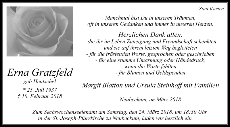 Hier finden Sie alle Traueranzeigen aus der Zeitung, die bisher für Erna Gratzfeld erschienen sind. Weitere Traueranzeigen, die in der Zeitung erscheinen, werden hier ebenfalls aufgelistet
