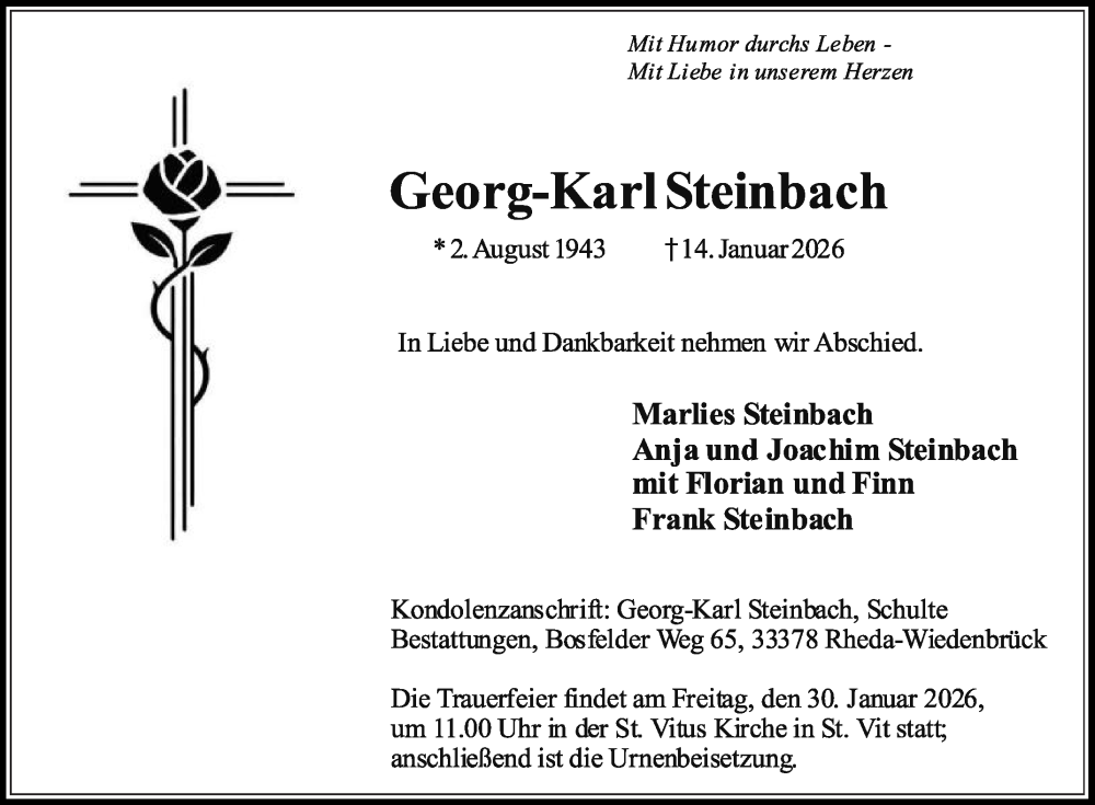 Hier finden Sie alle Traueranzeigen aus der Zeitung, die bisher für Georg-Karl Steinbach erschienen sind. Weitere Traueranzeigen, die in der Zeitung erscheinen, werden hier ebenfalls aufgelistet
