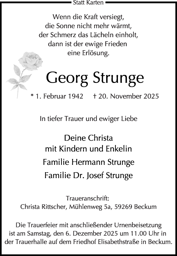 Hier finden Sie alle Traueranzeigen aus der Zeitung, die bisher für Georg Strunge erschienen sind. Weitere Traueranzeigen, die in der Zeitung erscheinen, werden hier ebenfalls aufgelistet