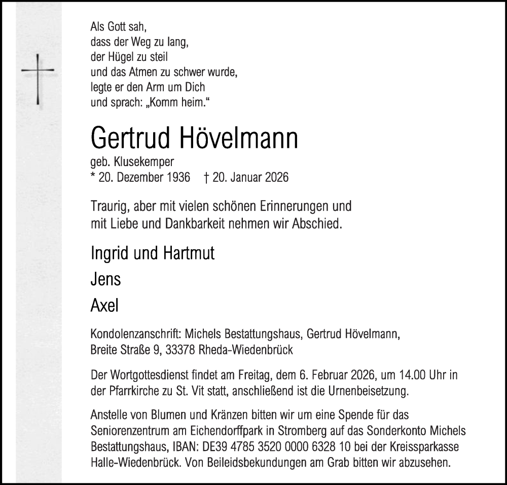 Hier finden Sie alle Traueranzeigen aus der Zeitung, die bisher für Gertrud Hövelmann erschienen sind. Weitere Traueranzeigen, die in der Zeitung erscheinen, werden hier ebenfalls aufgelistet