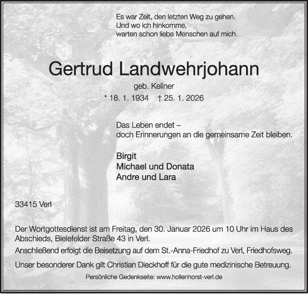 Hier finden Sie alle Traueranzeigen aus der Zeitung, die bisher für Gertrud Landwehrjohann erschienen sind. Weitere Traueranzeigen, die in der Zeitung erscheinen, werden hier ebenfalls aufgelistet