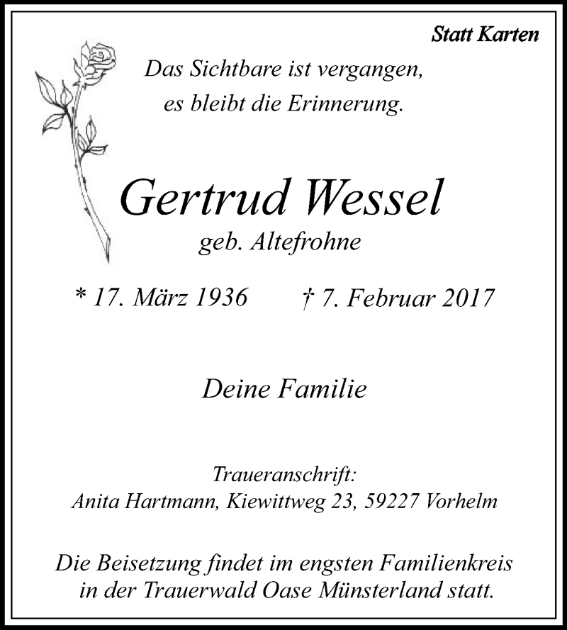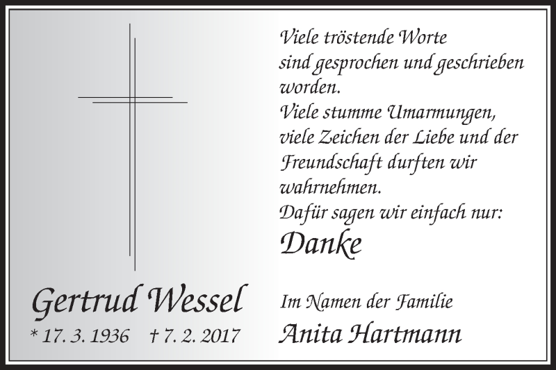 Hier finden Sie alle Traueranzeigen aus der Zeitung, die bisher für Gertrud Wessel erschienen sind. Weitere Traueranzeigen, die in der Zeitung erscheinen, werden hier ebenfalls aufgelistet