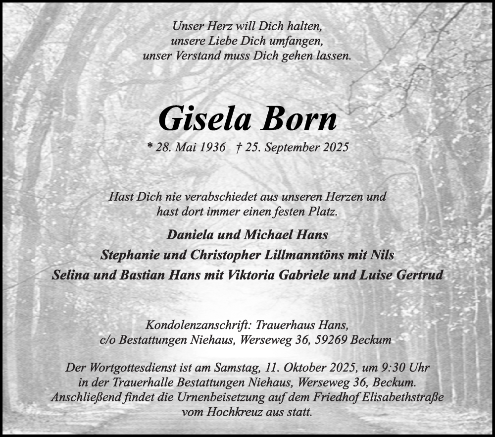 Hier finden Sie alle Traueranzeigen aus der Zeitung, die bisher für Gisela Born erschienen sind. Weitere Traueranzeigen, die in der Zeitung erscheinen, werden hier ebenfalls aufgelistet