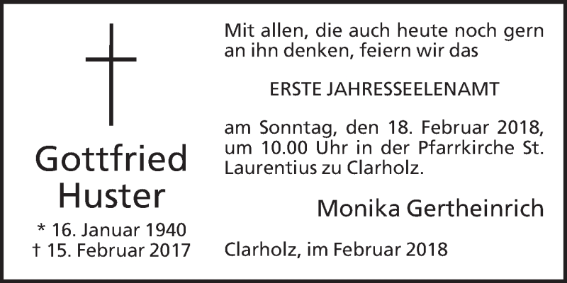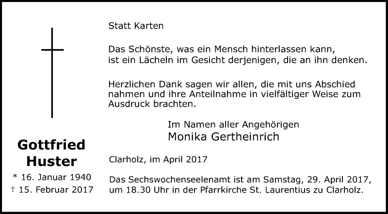Hier finden Sie alle Traueranzeigen aus der Zeitung, die bisher für Gottfried Huster erschienen sind. Weitere Traueranzeigen, die in der Zeitung erscheinen, werden hier ebenfalls aufgelistet