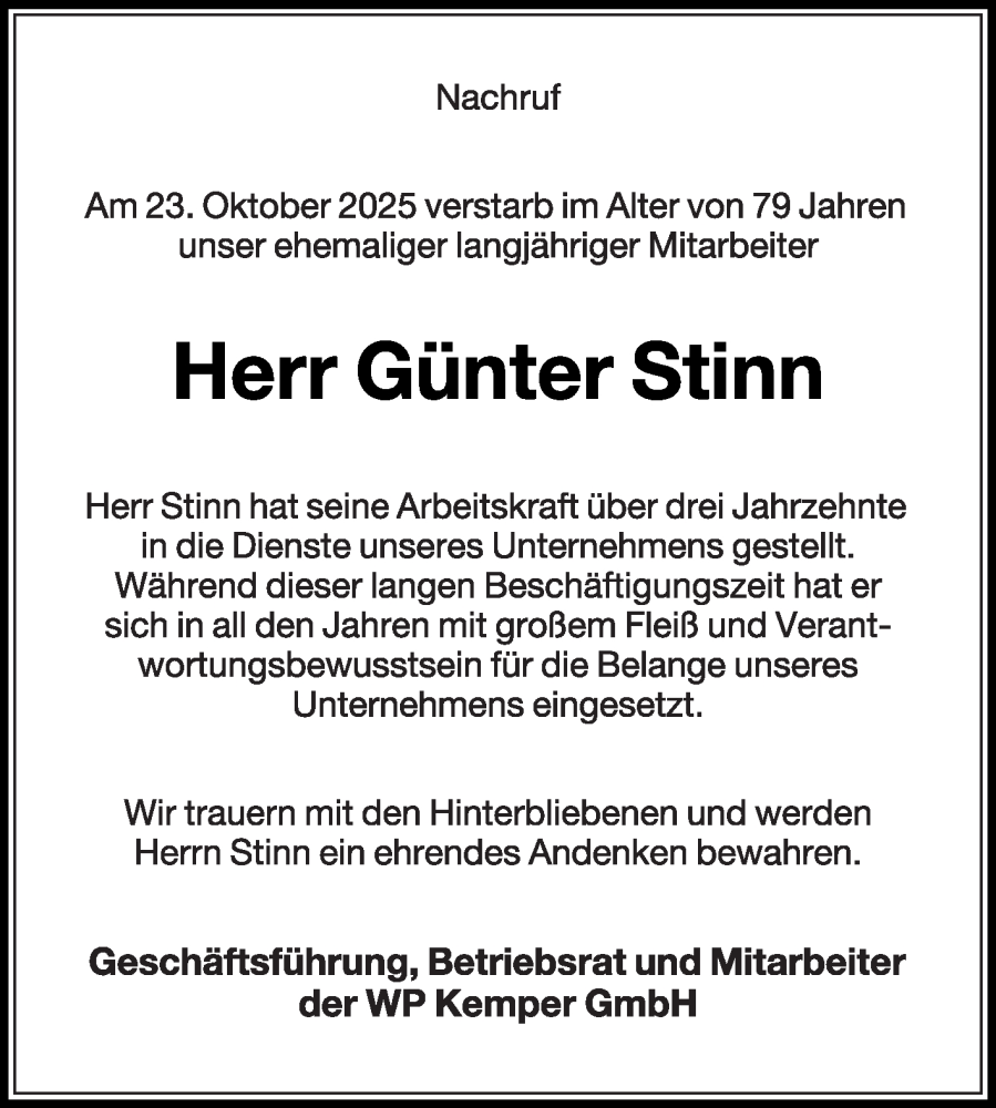 Hier finden Sie alle Traueranzeigen aus der Zeitung, die bisher für Günter Stinn erschienen sind. Weitere Traueranzeigen, die in der Zeitung erscheinen, werden hier ebenfalls aufgelistet