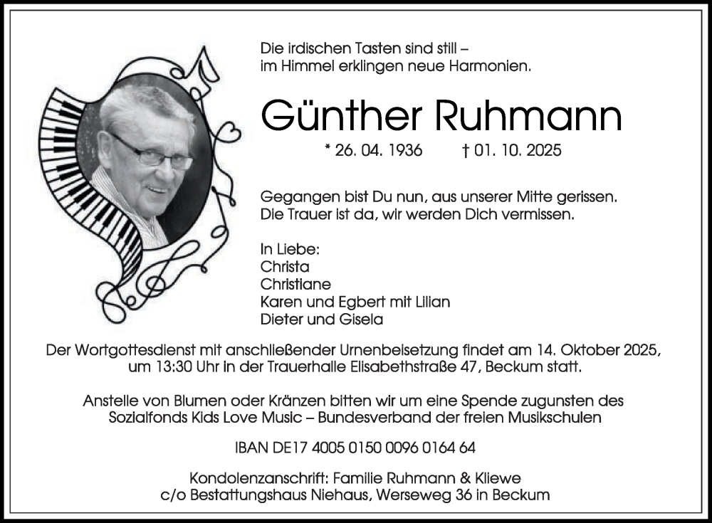 Hier finden Sie alle Traueranzeigen aus der Zeitung, die bisher für Günther Ruhmann erschienen sind. Weitere Traueranzeigen, die in der Zeitung erscheinen, werden hier ebenfalls aufgelistet