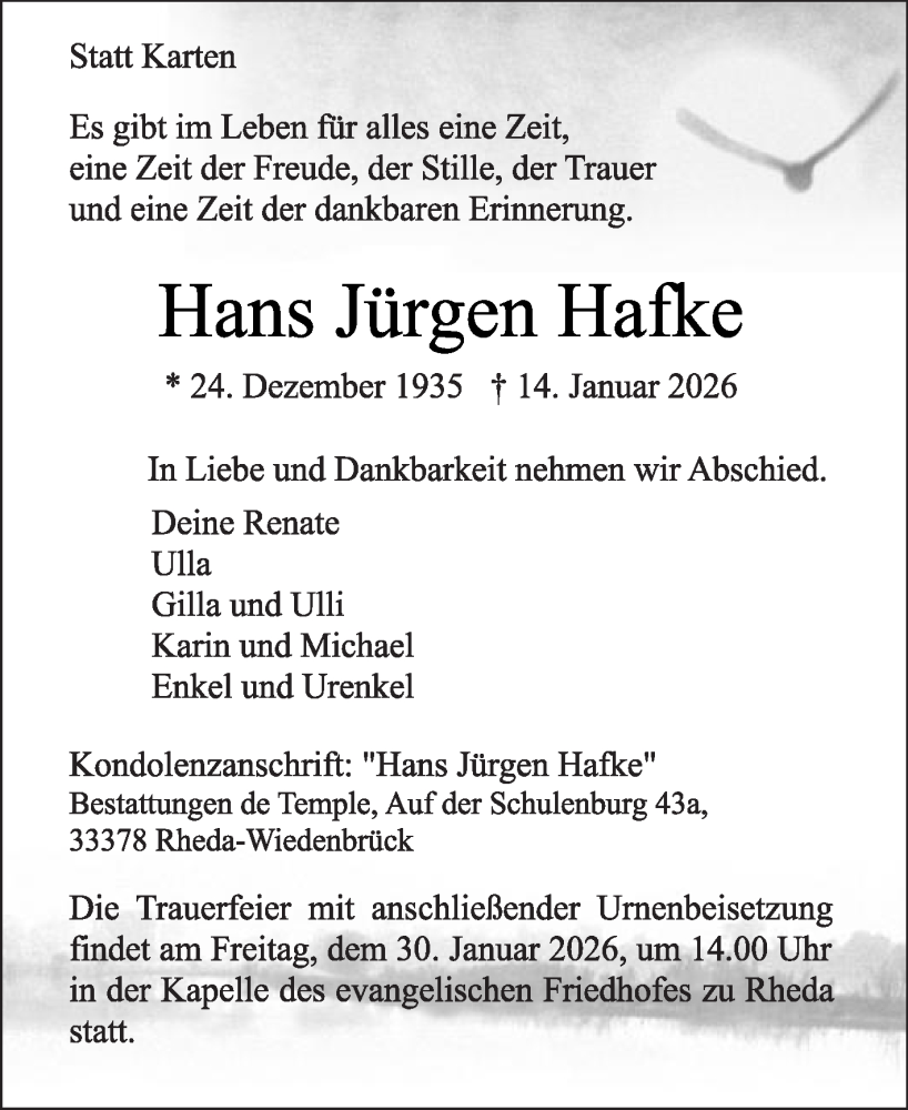 Hier finden Sie alle Traueranzeigen aus der Zeitung, die bisher für Hans Jürgen Hafke erschienen sind. Weitere Traueranzeigen, die in der Zeitung erscheinen, werden hier ebenfalls aufgelistet