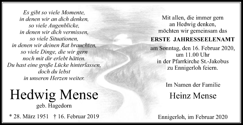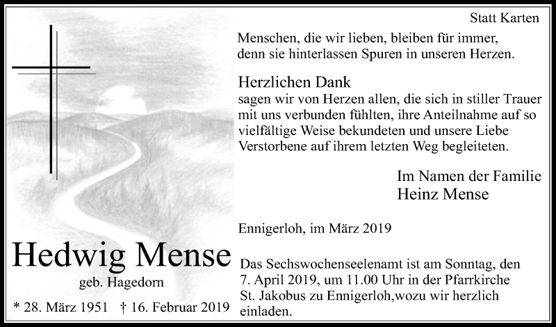Hier finden Sie alle Traueranzeigen aus der Zeitung, die bisher für Hedwig Mense erschienen sind. Weitere Traueranzeigen, die in der Zeitung erscheinen, werden hier ebenfalls aufgelistet