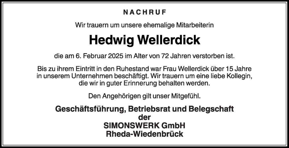 Hier finden Sie alle Traueranzeigen aus der Zeitung, die bisher für Hedwig Wellerdick erschienen sind. Weitere Traueranzeigen, die in der Zeitung erscheinen, werden hier ebenfalls aufgelistet