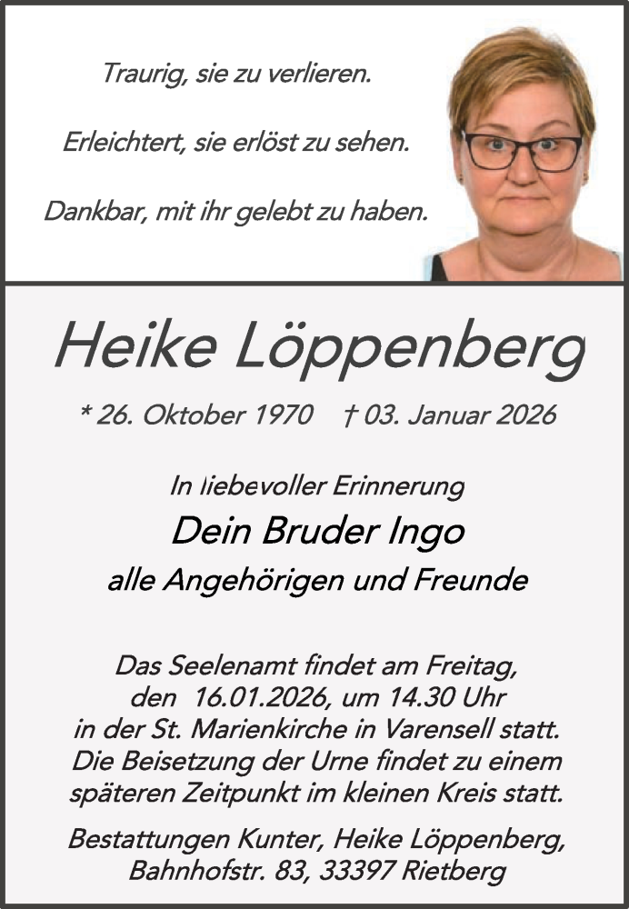 Hier finden Sie alle Traueranzeigen aus der Zeitung, die bisher für Heike Löppenberg erschienen sind. Weitere Traueranzeigen, die in der Zeitung erscheinen, werden hier ebenfalls aufgelistet