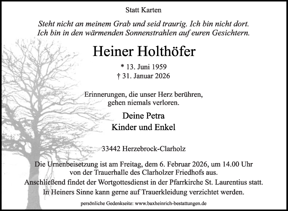 Hier finden Sie alle Traueranzeigen aus der Zeitung, die bisher für Heiner Holthöfer erschienen sind. Weitere Traueranzeigen, die in der Zeitung erscheinen, werden hier ebenfalls aufgelistet