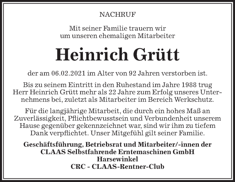 Hier finden Sie alle Traueranzeigen aus der Zeitung, die bisher für Heinrich Grütt erschienen sind. Weitere Traueranzeigen, die in der Zeitung erscheinen, werden hier ebenfalls aufgelistet