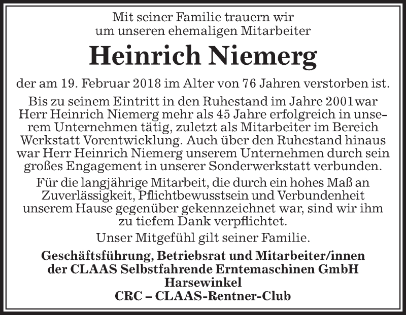 Hier finden Sie alle Traueranzeigen aus der Zeitung, die bisher für Heinrich Niemerg erschienen sind. Weitere Traueranzeigen, die in der Zeitung erscheinen, werden hier ebenfalls aufgelistet