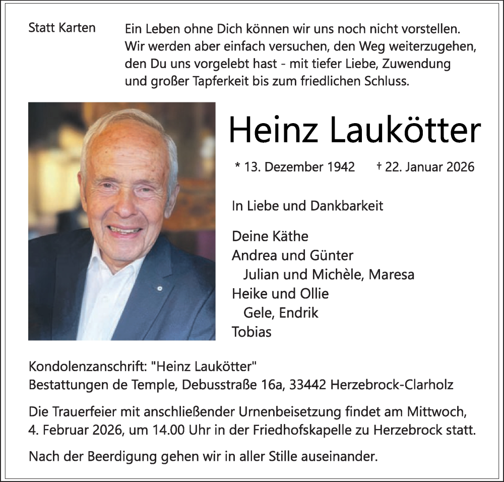 Hier finden Sie alle Traueranzeigen aus der Zeitung, die bisher für Heinz Laukötter erschienen sind. Weitere Traueranzeigen, die in der Zeitung erscheinen, werden hier ebenfalls aufgelistet