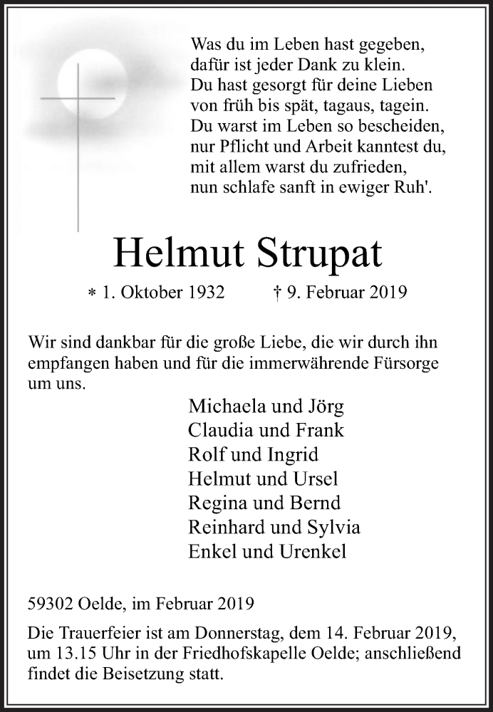 Hier finden Sie alle Traueranzeigen aus der Zeitung, die bisher für Helmut Strupat erschienen sind. Weitere Traueranzeigen, die in der Zeitung erscheinen, werden hier ebenfalls aufgelistet
