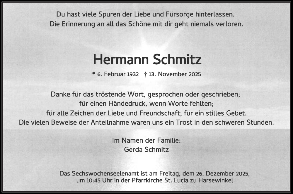 Hier finden Sie alle Traueranzeigen aus der Zeitung, die bisher für Hermann Schmitz erschienen sind. Weitere Traueranzeigen, die in der Zeitung erscheinen, werden hier ebenfalls aufgelistet