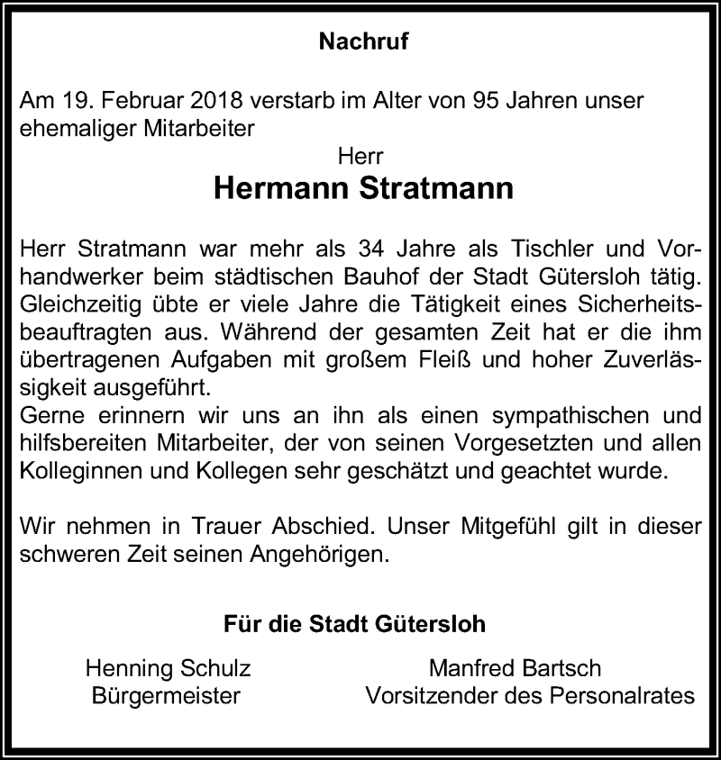 Hier finden Sie alle Traueranzeigen aus der Zeitung, die bisher für Hermann Stratmann erschienen sind. Weitere Traueranzeigen, die in der Zeitung erscheinen, werden hier ebenfalls aufgelistet