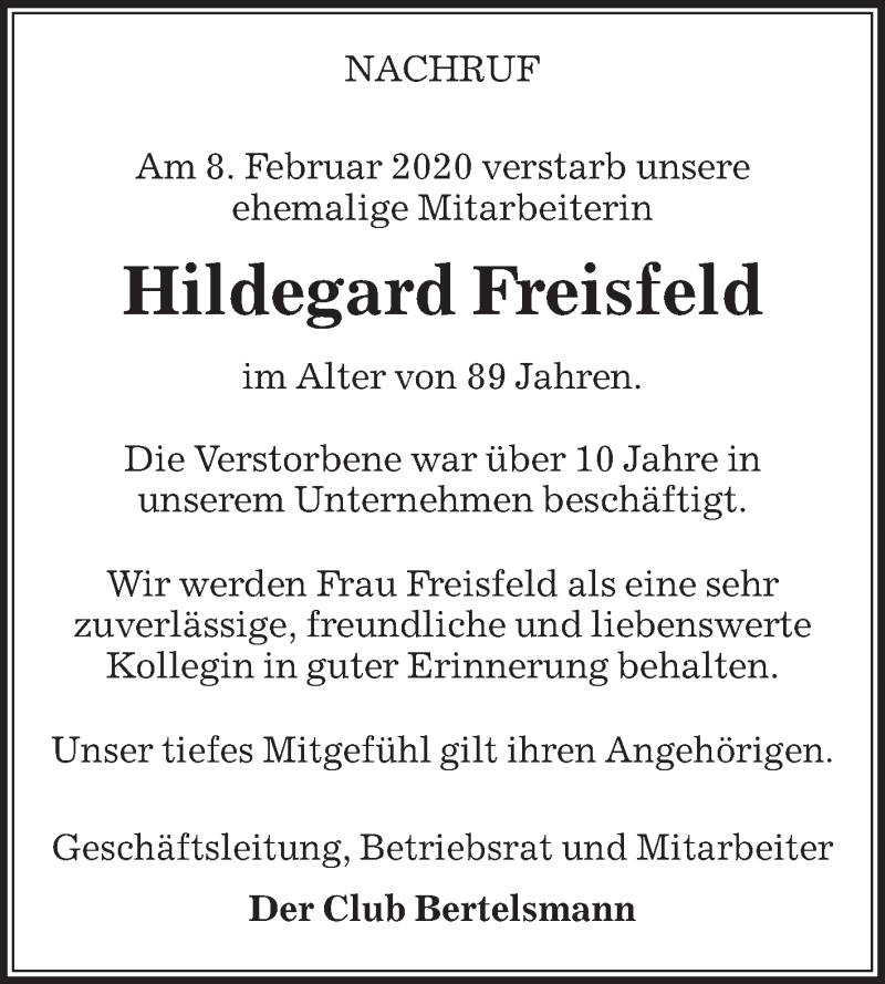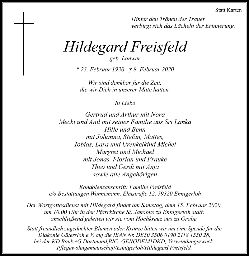 Hier finden Sie alle Traueranzeigen aus der Zeitung, die bisher für Hildegard Freisfeld erschienen sind. Weitere Traueranzeigen, die in der Zeitung erscheinen, werden hier ebenfalls aufgelistet