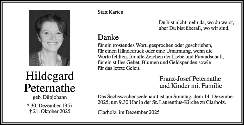 Hier finden Sie alle Traueranzeigen aus der Zeitung, die bisher für Hildegard Peternathe erschienen sind. Weitere Traueranzeigen, die in der Zeitung erscheinen, werden hier ebenfalls aufgelistet