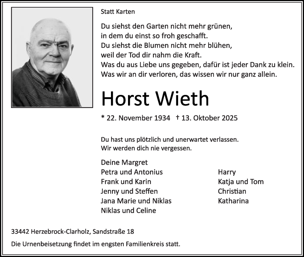 Hier finden Sie alle Traueranzeigen aus der Zeitung, die bisher für Horst Wieth erschienen sind. Weitere Traueranzeigen, die in der Zeitung erscheinen, werden hier ebenfalls aufgelistet
