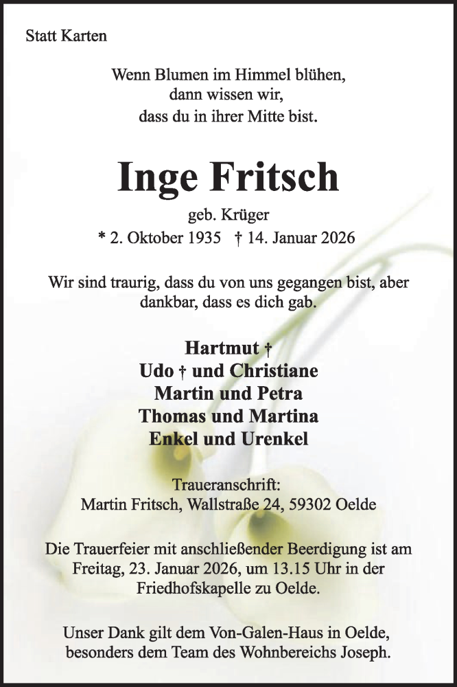 Hier finden Sie alle Traueranzeigen aus der Zeitung, die bisher für Inge Fritsch erschienen sind. Weitere Traueranzeigen, die in der Zeitung erscheinen, werden hier ebenfalls aufgelistet